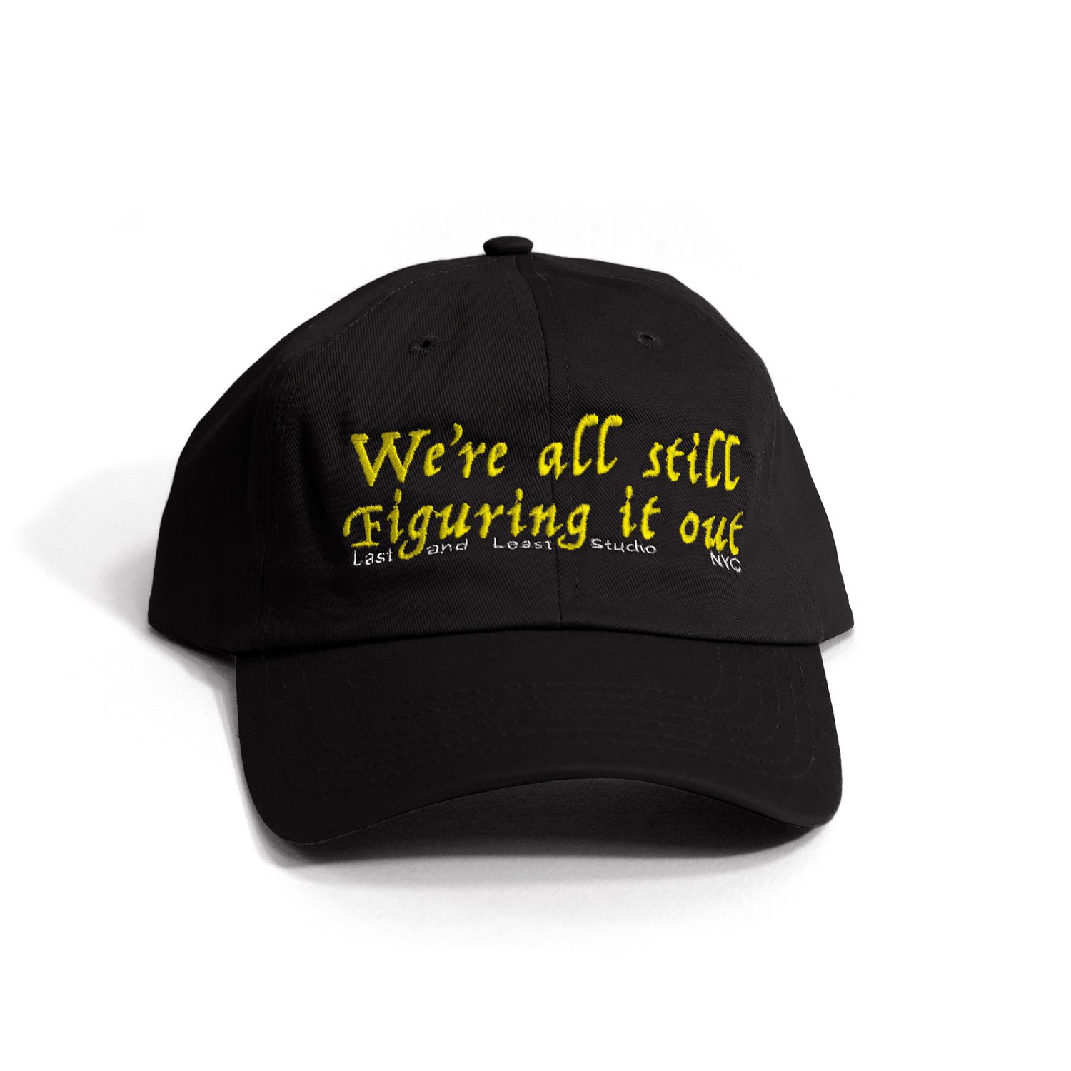 "WE'RE ALL STILL FIGURING IT OUT" embroidered hats; camo hats are vintage stock blanks from the 90's and have a larger, higher fit. Black, blue, and brown colorways are dad hat fit. All hats are adjustable and OSFA.